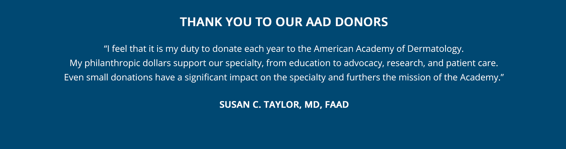 “I have included the AAD in my will. I consider it an honor to offer support which will continue the work of the Academy into the future. It is meaningful to continue to support our Academy after we are gone.” - Stephen B. Webster, MD, FAAD